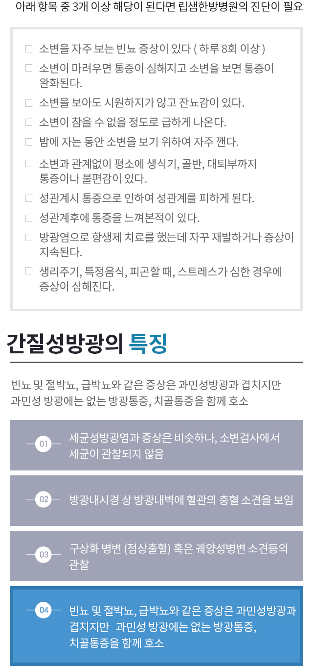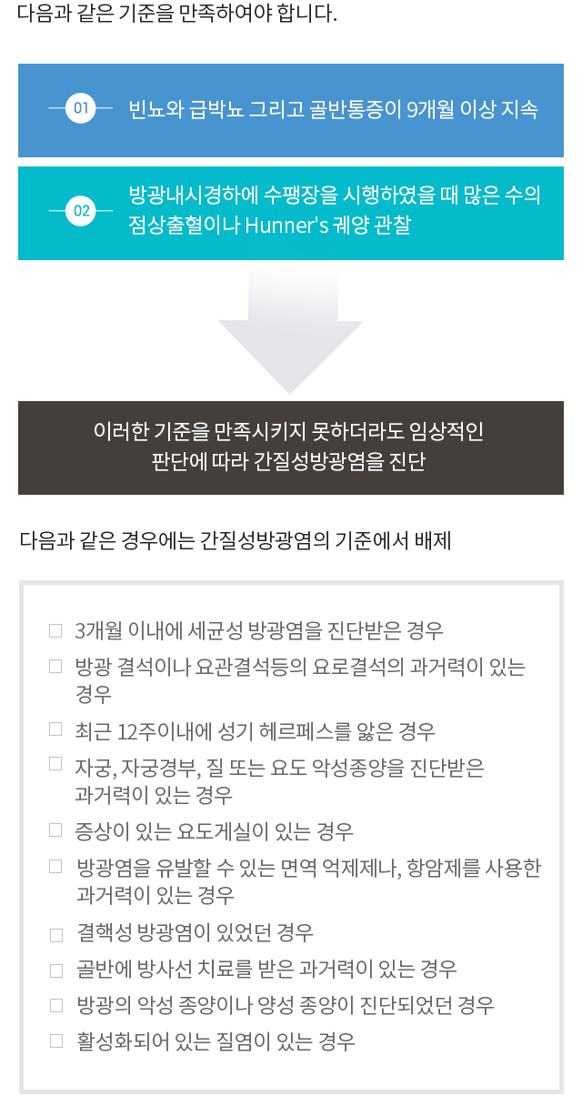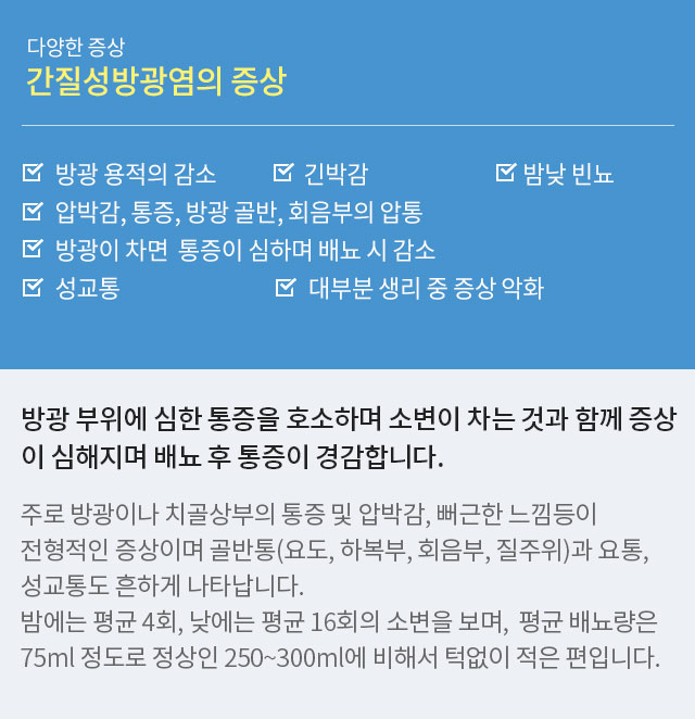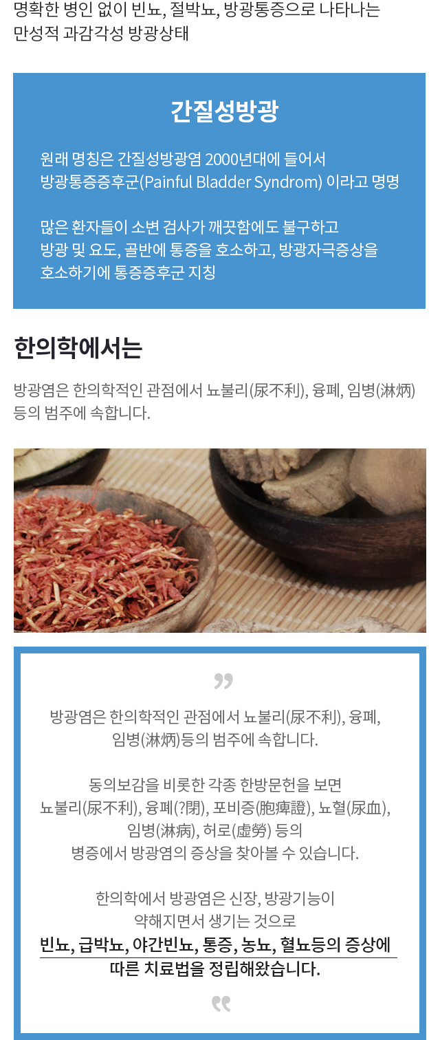 양방치료로 빈뇨, 소변통, 야뇨, 급박뇨등의증상을 빠르게 해소골반의 구조적인 문제를 해결하여간질성 방광의 원인을 제거한방치료로 간질성 방광의 재발을 방지