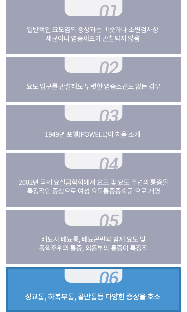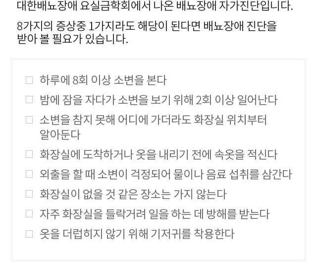여성질환 > 과민성방광 여성질환 > 간질성방광 여성질환 > 만성방광염 여성질환 > 여성요도증후군 여성질환 > 요실금
