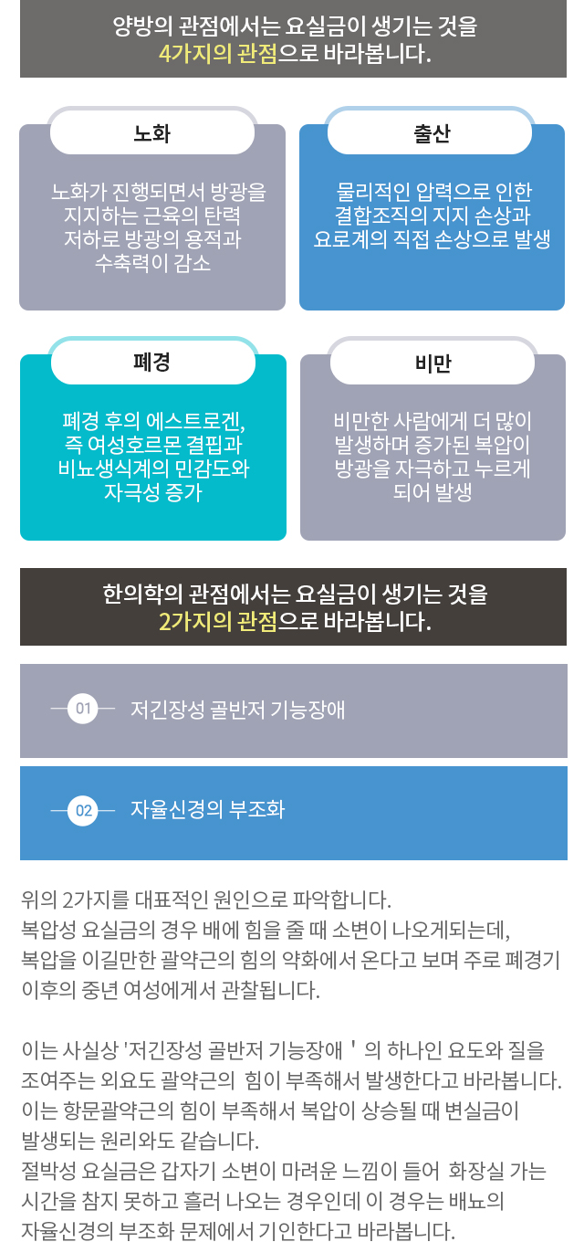 양방치료로 본인도 모르게소변이 나오는 증상을 빠르게 해소요실금 증상을 유발하는골반 저근의 구조적인 문제를 해결한방치료로 요실금의근본적인 문제를 치료하고 재발을 방지