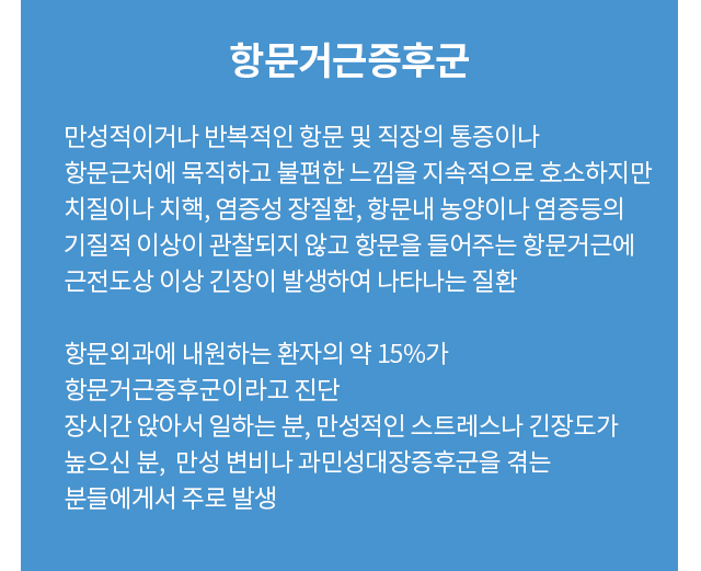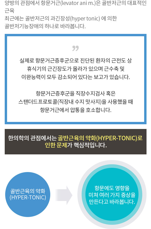 양방치료로 항문에 생기는 불편함을 빠르게 해소과긴장성 골반근육장애의 관점에서골반의 구조적인 문제를 해결한방치료로 골반의근본적인 문제를치료하고 재발을 방지