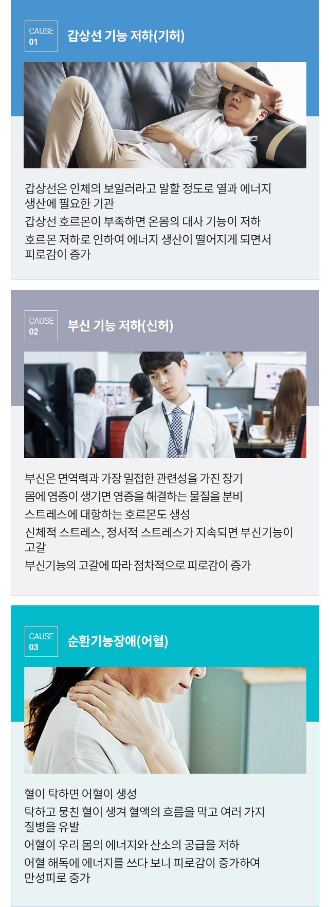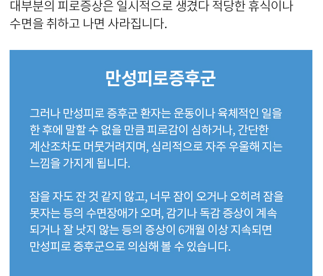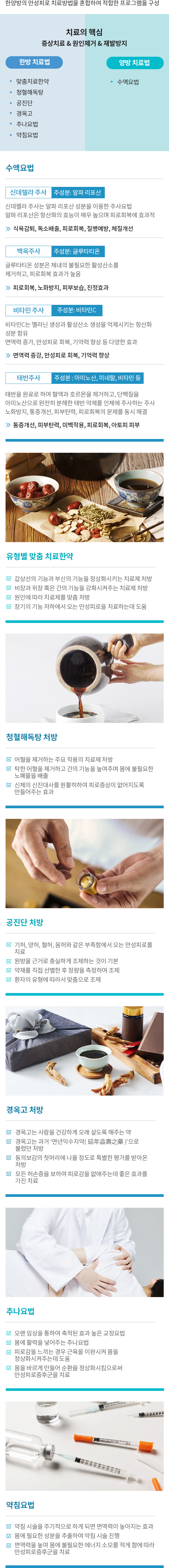 한양방협진을 통한 세밀한 원인 파악양방의 수액요법으로 빠른 피로감 해소한방의 치료법을 통한 원인제거와 체질 개선