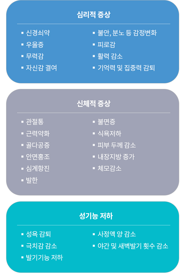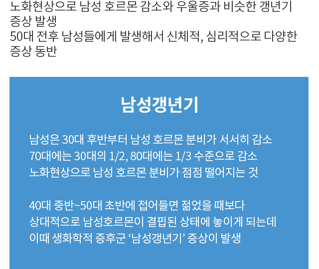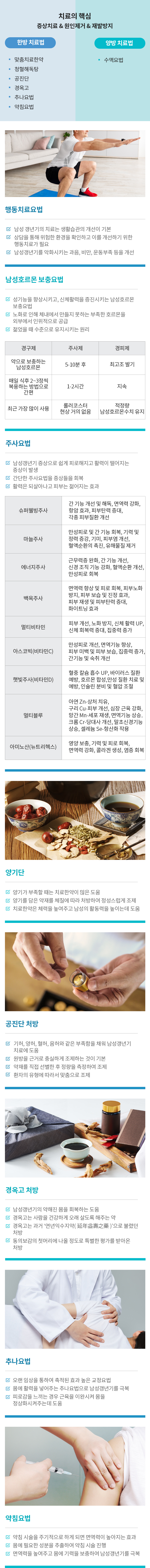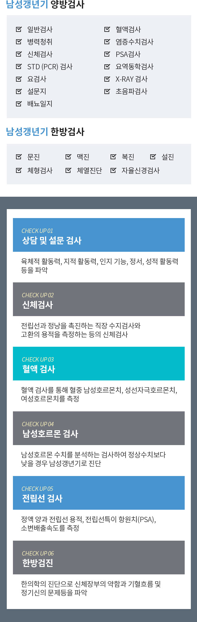 한양방협진으로 남성 갱년기에 대한 세밀한 진단양방의 수액요법으로 남성갱년기의 제반증상을 빠르게 해결한방의 다양한 치료법으로 갱년기의증상 완화와 성기능의 회복